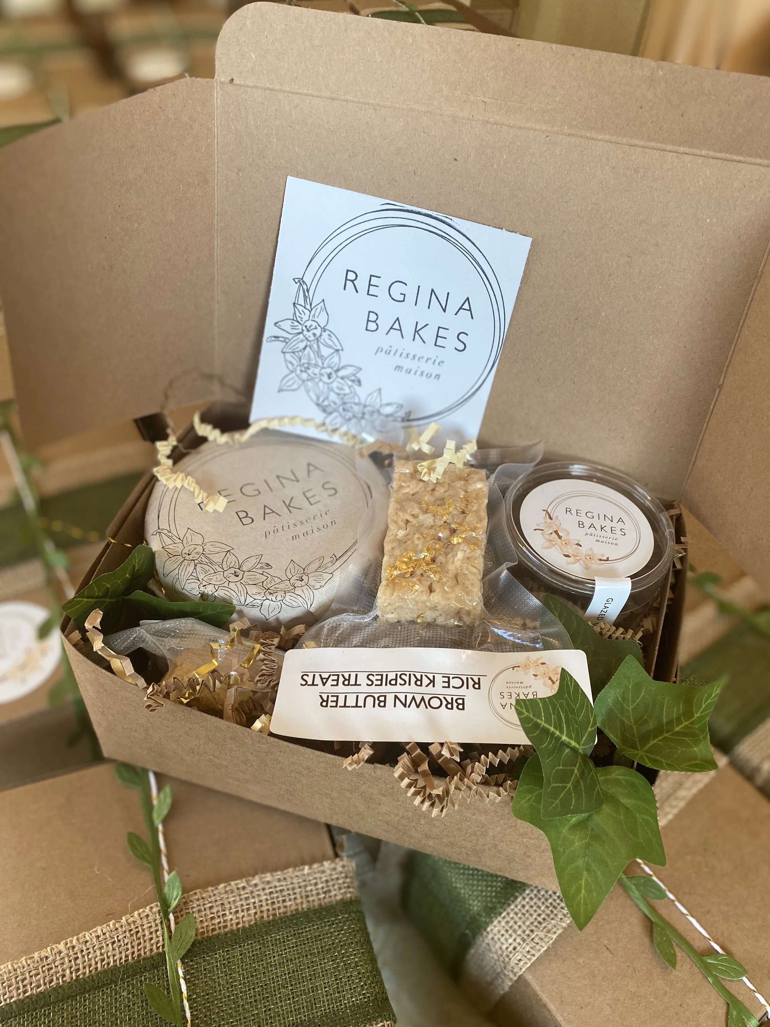 Customizable treat box filled with 3 different treats. Decorated packaging included.