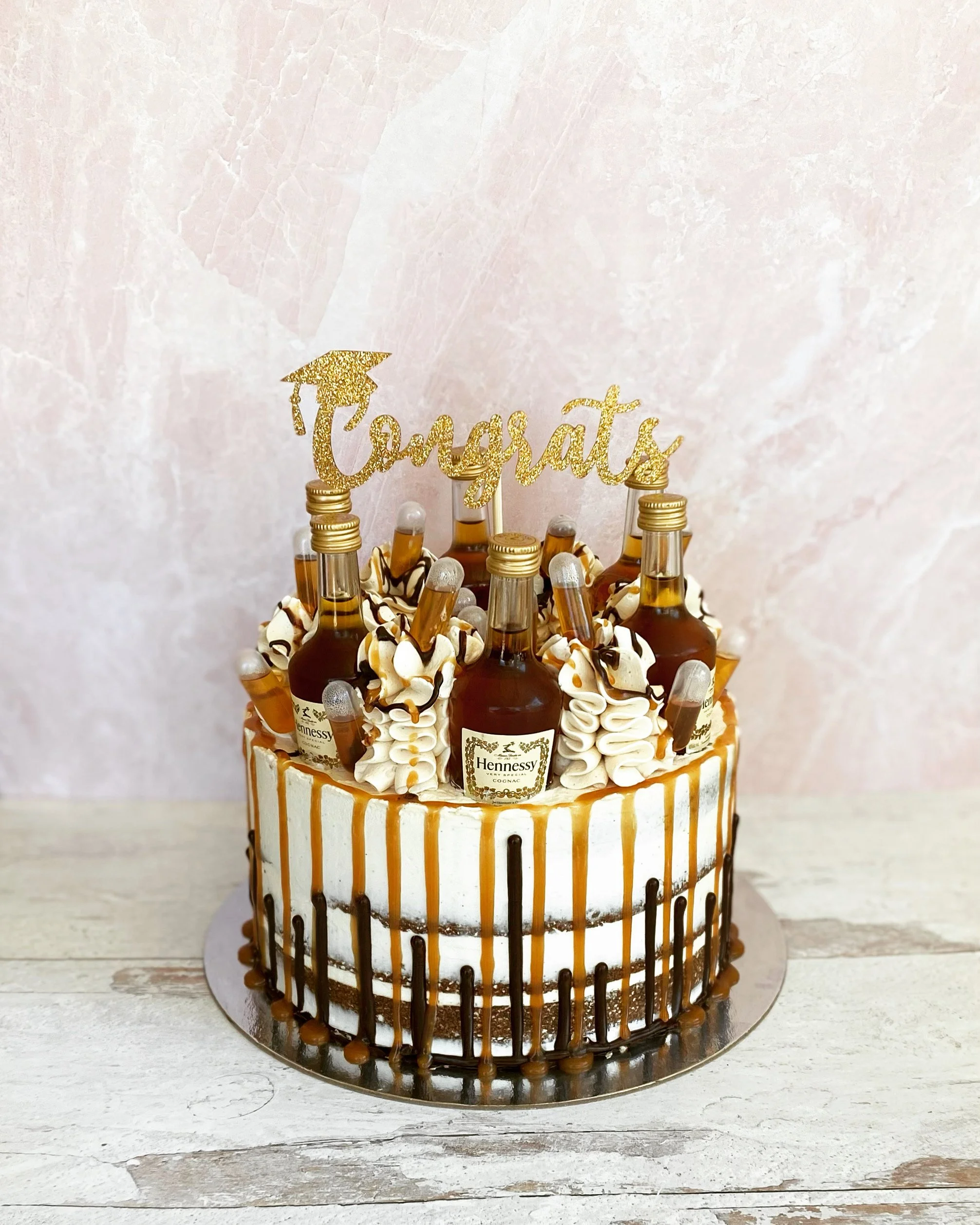 8” - Spice cake, Hennessy syrup, Hennessy salted caramel, dark chocolate, and vanilla buttercream.