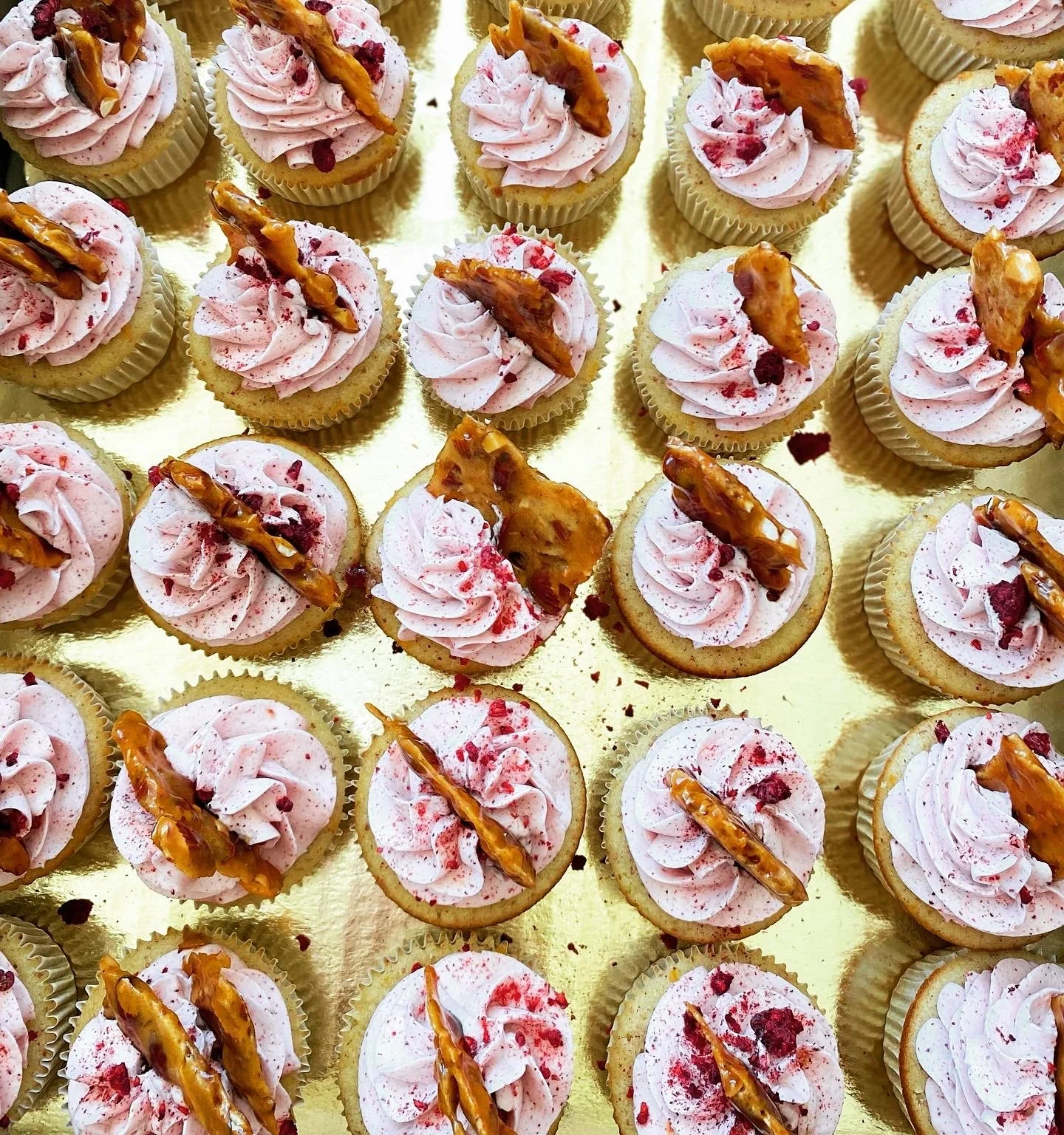 12 Cupcakes - Almond orange cake, raspberry jam, raspberry buttercream, almond brittle.