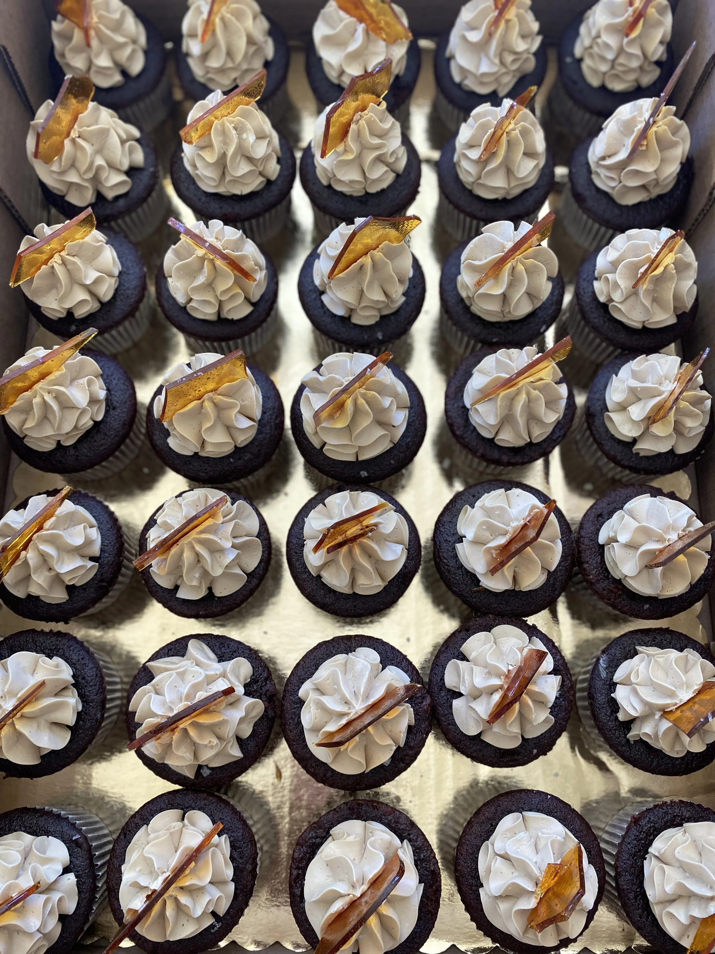 12 Cupcakes - Chocolate cake, salted caramel, coffee buttercream, caramel glass, sea salt flakes.